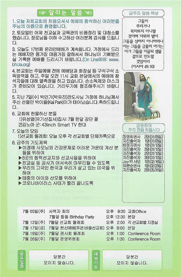 07/12/20 주일 교회 소식 페이지 정보 작성자 댓글 0건 조회 2,684회 작성일 20-07-11 08:51 목록 본문 이전글07/19/20 주일 교회 소식 20.07.18 다음글07/05/20 주일 교회 소식 20.07.03 댓글 0 댓글목록 등록된 댓글이 없습니다. 목록