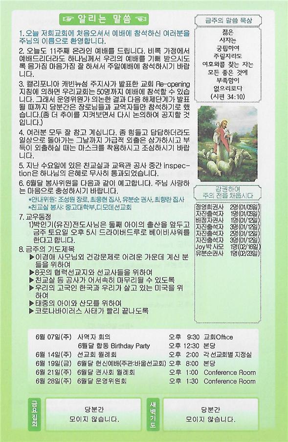 05/31/20 주일 교회 소식 페이지 정보 작성자 댓글 0건 조회 2,888회 작성일 20-05-30 15:27 목록 본문 이전글06/07/20 주일 교회 소식 20.06.06 다음글05/24/20 주일 교회 소식 20.05.22 댓글 0 댓글목록 등록된 댓글이 없습니다. 목록