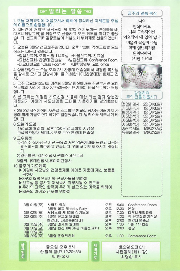 03/08/20 주일 교회 소식 페이지 정보 작성자 댓글 0건 조회 2,504회 작성일 20-03-07 11:46 목록 본문 이전글03/15/20 주일 교회 소식 20.03.14 다음글03/01/20 주일 교회 소식 20.02.29 댓글 0 댓글목록 등록된 댓글이 없습니다. 목록