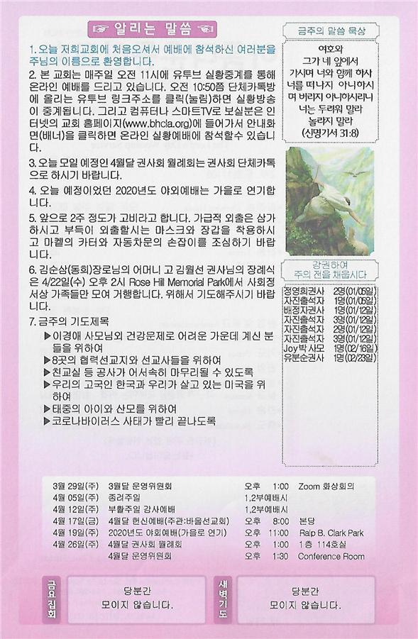 04/19/20 주일 교회 소식 페이지 정보 작성자 댓글 0건 조회 3,044회 작성일 20-04-17 07:38 목록 본문 이전글04/26/20 주일 교회 소식 20.04.23 다음글04/12/20 주일 교회 소식 20.04.10 댓글 0 댓글목록 등록된 댓글이 없습니다. 목록