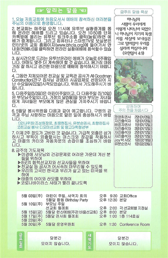 04/26/20 주일 교회 소식 페이지 정보 작성자 댓글 0건 조회 2,637회 작성일 20-04-23 19:51 목록 본문 이전글05/03/20 주일 교회 소식 20.04.30 다음글04/19/20 주일 교회 소식 20.04.17 댓글 0 댓글목록 등록된 댓글이 없습니다. 목록