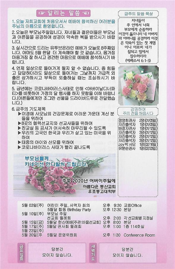 05/10/20 주일 교회 소식 페이지 정보 작성자 댓글 0건 조회 2,754회 작성일 20-05-07 20:21 목록 본문 이전글05/17/20 주일 교회 소식 20.05.15 다음글05/03/20 주일 교회 소식 20.04.30 댓글 0 댓글목록 등록된 댓글이 없습니다. 목록