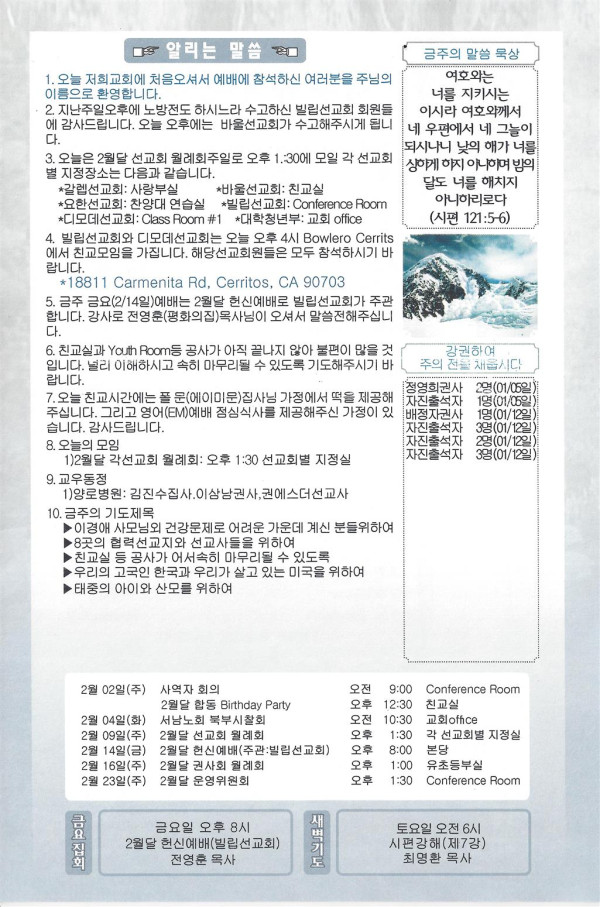 02/09/20 주일 교회 소식 페이지 정보 작성자 댓글 0건 조회 2,391회 작성일 20-02-08 13:04 목록 본문 이전글02/16/20 주일 교회 소식 20.02.15 다음글02/02/20 주일 교회소식 20.02.01 댓글 0 댓글목록 등록된 댓글이 없습니다. 목록
