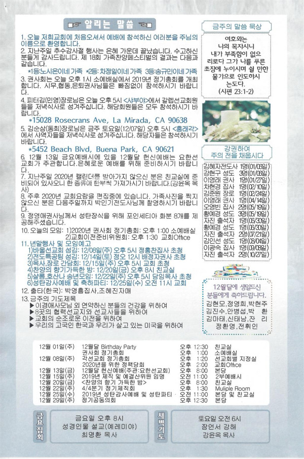 12/01/19 주일 교회 소식 페이지 정보 작성자 댓글 0건 조회 2,688회 작성일 19-11-30 12:00 목록 본문 이전글12/08/19 주일 교회 소식 19.12.07 다음글11/24/19 주일 교회 소식 19.11.23 댓글 0 댓글목록 등록된 댓글이 없습니다. 목록