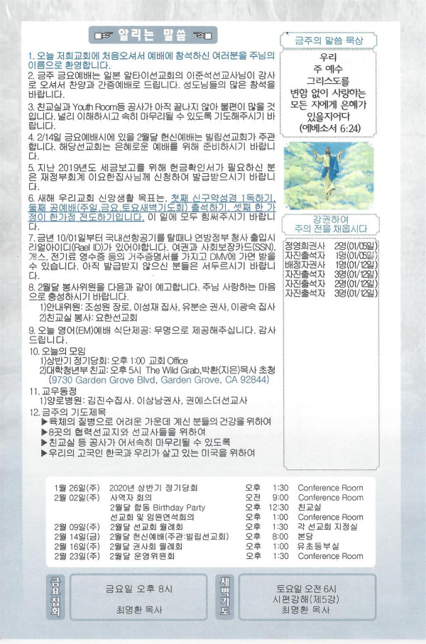 01/26/20 주일교회 소식 페이지 정보 작성자 댓글 0건 조회 2,566회 작성일 20-01-25 13:53 목록 본문 이전글02/02/20 주일 교회소식 20.02.01 다음글01/19/20 주일 교회 소식 20.01.18 댓글 0 댓글목록 등록된 댓글이 없습니다. 목록