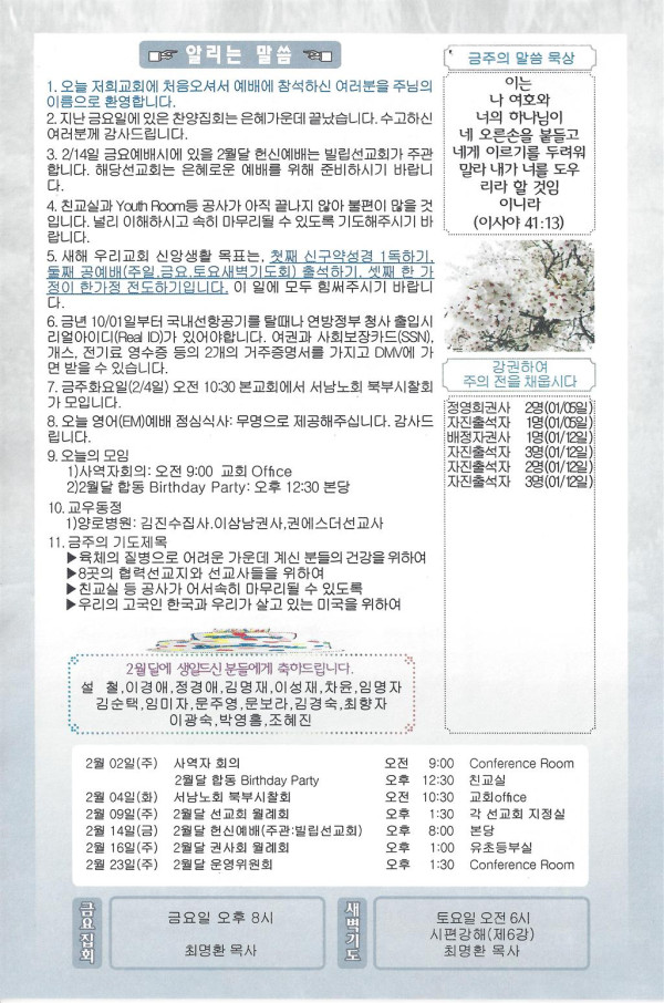 02/02/20 주일 교회소식 페이지 정보 작성자 댓글 0건 조회 2,011회 작성일 20-02-01 11:58 목록 본문 이전글02/09/20 주일 교회 소식 20.02.08 다음글01/26/20 주일교회 소식 20.01.25 댓글 0 댓글목록 등록된 댓글이 없습니다. 목록
