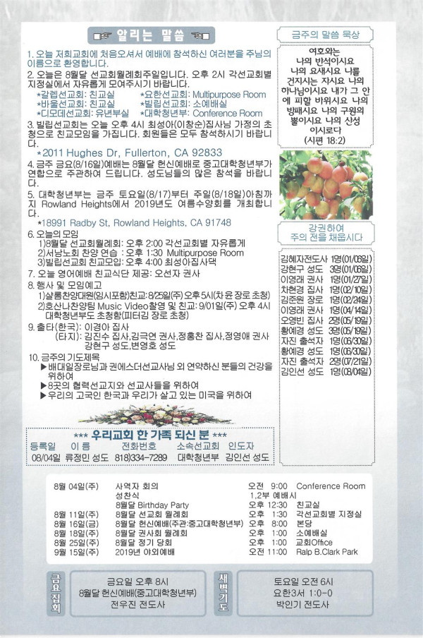 08/11/19 주일 교회 소식 페이지 정보 작성자 댓글 0건 조회 2,923회 작성일 19-08-10 11:12 목록 본문 이전글08/18/19 주일 교회 소식 19.08.17 다음글08/04/19 주일 교회 소식 19.08.03 댓글 0 댓글목록 등록된 댓글이 없습니다. 목록