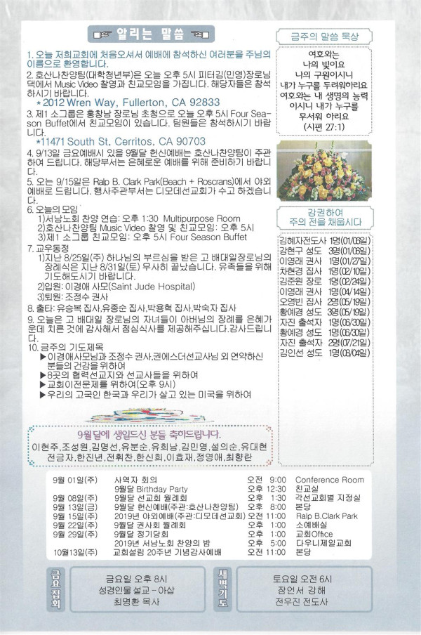 09/01/19 주일 교회 소식 페이지 정보 작성자 댓글 0건 조회 2,617회 작성일 19-08-31 17:00 목록 본문 이전글09/08-/19 주일 교회 소식 19.09.07 다음글08/25/19 주일 교회 소식 19.08.24 댓글 0 댓글목록 등록된 댓글이 없습니다. 목록
