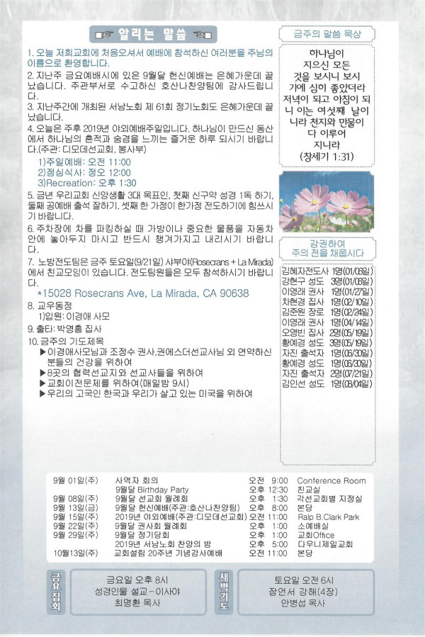 09/15/19 주일 교회 소식 페이지 정보 작성자 댓글 0건 조회 2,851회 작성일 19-09-14 12:02 목록 본문 이전글09/22/19 주일 교회 소식 19.09.21 다음글09/08-/19 주일 교회 소식 19.09.07 댓글 0 댓글목록 등록된 댓글이 없습니다. 목록