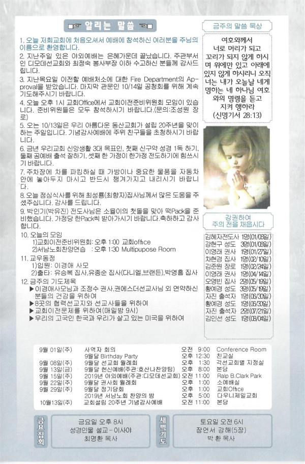 09/22/19 주일 교회 소식 페이지 정보 작성자 댓글 0건 조회 2,665회 작성일 19-09-21 11:58 목록 본문 이전글09/29/19 주일 교회 소식 19.09.28 다음글09/15/19 주일 교회 소식 19.09.14 댓글 0 댓글목록 등록된 댓글이 없습니다. 목록