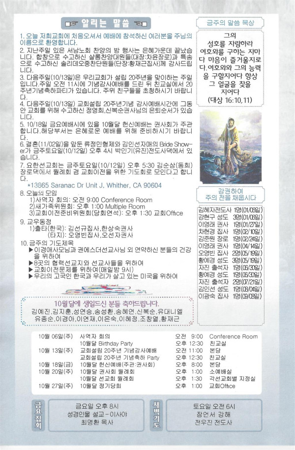 10/06/19 주일 교회 소식 페이지 정보 작성자 댓글 0건 조회 2,838회 작성일 19-10-05 14:23 목록 본문 이전글10/13/19 주일 교회 소식 19.10.12 다음글09/29/19 주일 교회 소식 19.09.28 댓글 0 댓글목록 등록된 댓글이 없습니다. 목록