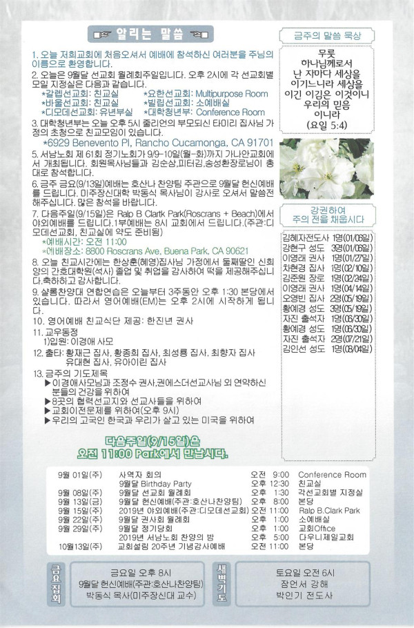 09/08-/19 주일 교회 소식 페이지 정보 작성자 댓글 0건 조회 2,834회 작성일 19-09-07 09:24 목록 본문 이전글09/15/19 주일 교회 소식 19.09.14 다음글09/01/19 주일 교회 소식 19.08.31 댓글 0 댓글목록 등록된 댓글이 없습니다. 목록