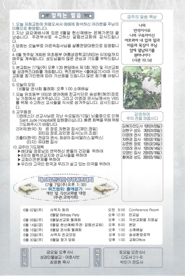 06/16/19 주일 교회 소식 페이지 정보 작성자 댓글 0건 조회 2,843회 작성일 19-06-15 00:00 목록 본문 이전글06/23/19 주일 교회 소식 19.06.22 다음글06/09/19 주일 교회 소식 19.06.08 댓글 0 댓글목록 등록된 댓글이 없습니다. 목록