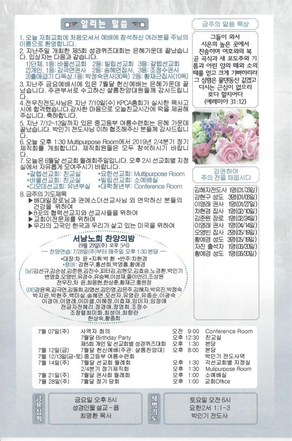 07/14/19 주일 교회 소식 페이지 정보 작성자 댓글 0건 조회 3,179회 작성일 19-07-13 13:23 목록 본문 이전글07/21/19 주일 교회 소식 19.07.20 다음글07/07/19 주일 교회 소식 19.07.06 댓글 0 댓글목록 등록된 댓글이 없습니다. 목록
