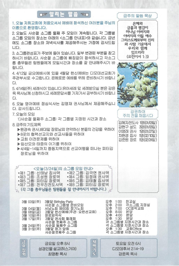 03/24/19 주일 교회 소식 페이지 정보 작성자 댓글 0건 조회 2,995회 작성일 19-03-23 10:40 목록 본문 이전글03/31/19 주일 교회 소식 19.03.30 다음글03/17/19 주일 교회 소식 19.03.16 댓글 0 댓글목록 등록된 댓글이 없습니다. 목록
