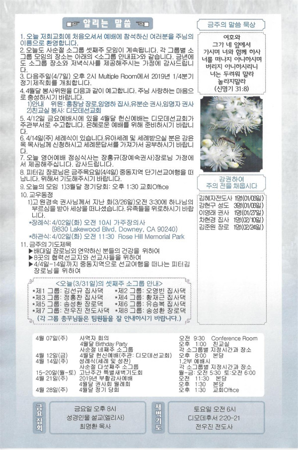03/31/19 주일 교회 소식 페이지 정보 작성자 댓글 0건 조회 2,810회 작성일 19-03-30 12:25 목록 본문 이전글04/07/19 주일 교회 소식 19.04.06 다음글03/24/19 주일 교회 소식 19.03.23 댓글 0 댓글목록 등록된 댓글이 없습니다. 목록