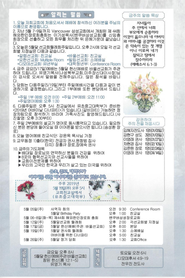 05/12/19 주일 교회 소식 페이지 정보 작성자 댓글 0건 조회 2,836회 작성일 19-05-11 00:00 목록 본문 이전글05/19/19 주일 교회 소식 19.05.18 다음글05/05/19 주일 교회소식 19.05.04 댓글 0 댓글목록 등록된 댓글이 없습니다. 목록