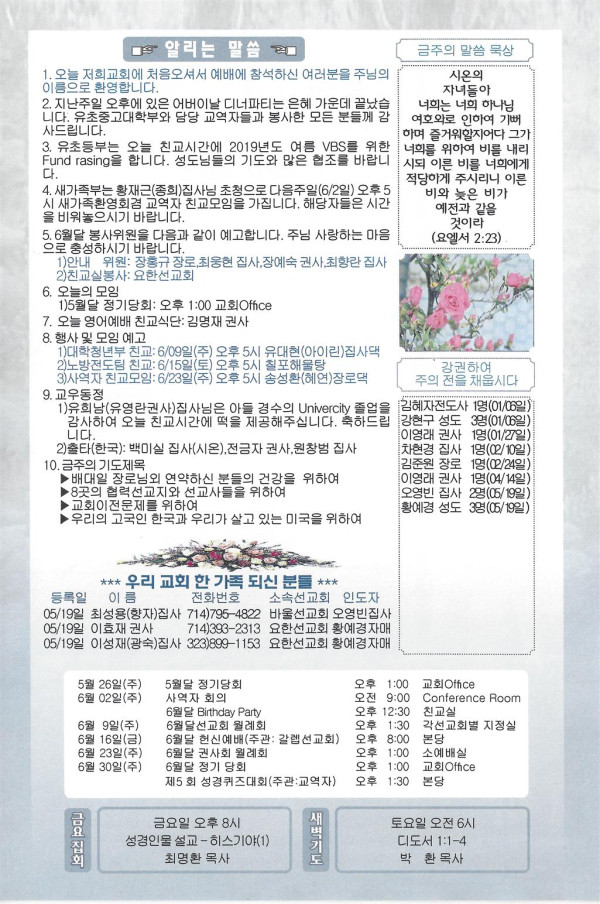 05/26-19 주일 교회 소식 페이지 정보 작성자 댓글 0건 조회 3,079회 작성일 19-05-25 11:00 목록 본문 이전글06/02/19 주일 교회 소식 19.06.01 다음글05/19/19 주일 교회 소식 19.05.18 댓글 0 댓글목록 등록된 댓글이 없습니다. 목록