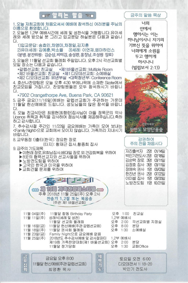 11/11/18 주일 교회 소식 페이지 정보 작성자 댓글 0건 조회 2,500회 작성일 18-11-10 10:32 목록 본문 이전글11/18/18 주일 교회 소식 18.11.17 다음글11/04/18 주일 교회 소식 18.11.03 댓글 0 댓글목록 등록된 댓글이 없습니다. 목록