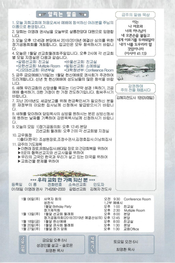 01/13/19 주일 교회 소식 페이지 정보 작성자 댓글 0건 조회 2,846회 작성일 19-01-12 10:03 목록 본문 이전글01/20/19 주일 교회 소식 19.01.19 다음글01/06/19 주일 교회 소식 19.01.05 댓글 0 댓글목록 등록된 댓글이 없습니다. 목록