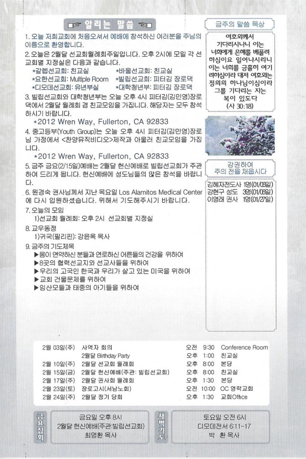 02/10/19 주일 교회소식 페이지 정보 작성자 댓글 0건 조회 2,604회 작성일 19-02-09 08:52 목록 본문 이전글02/17/19 주일 교회 소식 19.02.16 다음글02/03/19 주일 교회 소식 19.02.02 댓글 0 댓글목록 등록된 댓글이 없습니다. 목록