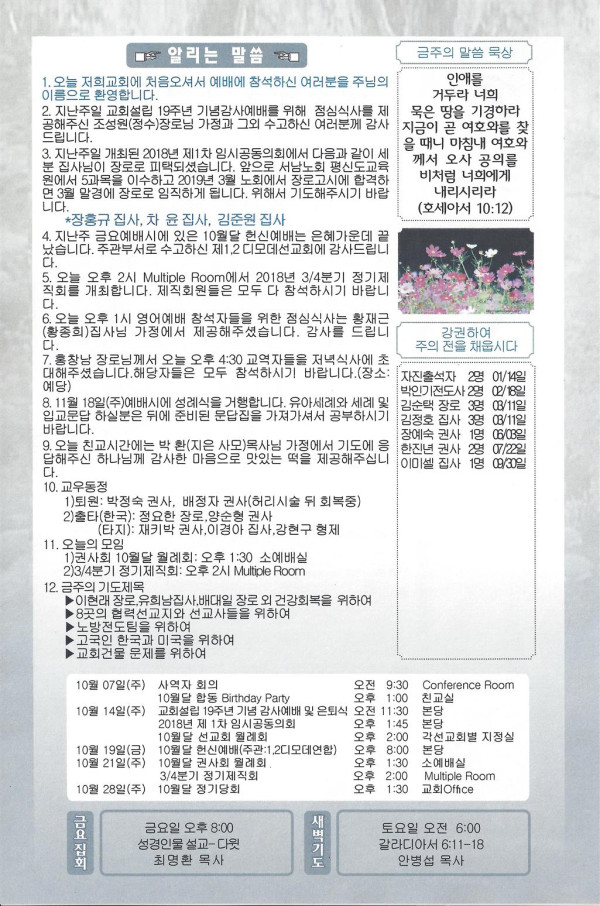 10/21/18 주일 교회소식 페이지 정보 작성자 댓글 0건 조회 2,614회 작성일 18-10-20 14:12 목록 본문 이전글10/28/18 주일 교회 소식 18.10.27 다음글10/14/18 주일 교회 소식 18.10.13 댓글 0 댓글목록 등록된 댓글이 없습니다. 목록