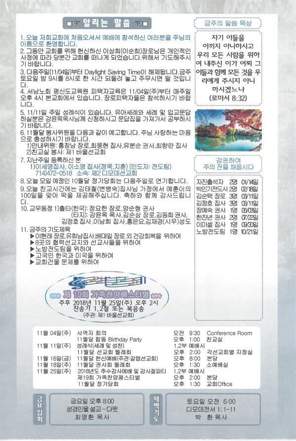 10/28/18 주일 교회 소식 페이지 정보 작성자 댓글 0건 조회 2,536회 작성일 18-10-27 10:20 목록 본문 이전글11/04/18 주일 교회 소식 18.11.03 다음글10/21/18 주일 교회소식 18.10.20 댓글 0 댓글목록 등록된 댓글이 없습니다. 목록