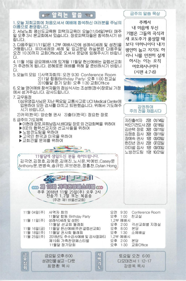 11/04/18 주일 교회 소식 페이지 정보 작성자 댓글 0건 조회 2,710회 작성일 18-11-03 09:34 목록 본문 이전글11/11/18 주일 교회 소식 18.11.10 다음글10/28/18 주일 교회 소식 18.10.27 댓글 0 댓글목록 등록된 댓글이 없습니다. 목록