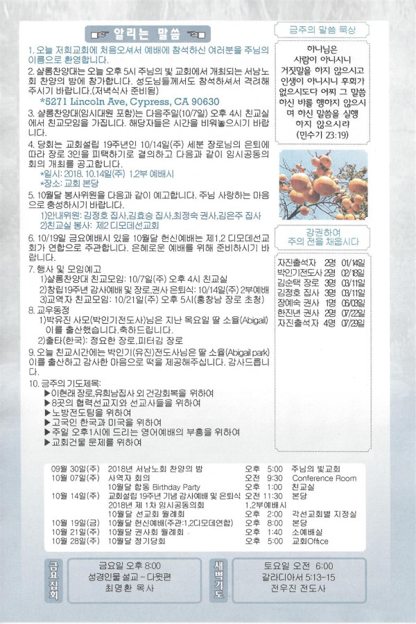 09/30/18 주일 교회 소식 페이지 정보 작성자 댓글 0건 조회 3,034회 작성일 18-09-29 11:44 목록 본문 이전글10/07/18 주일 교회 소식 18.10.06 다음글09/23/18 주일 교회 소식 18.09.22 댓글 0 댓글목록 등록된 댓글이 없습니다. 목록