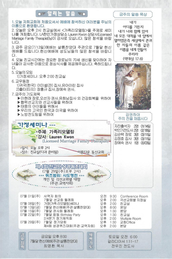 07/08/18 주일 교회 소식 페이지 정보 작성자 댓글 0건 조회 2,740회 작성일 18-07-07 09:03 목록 본문 이전글07/15/18 주일 교회 소식 18.07.14 다음글07/01/18 주일 교회 소식 18.06.30 댓글 0 댓글목록 등록된 댓글이 없습니다. 목록