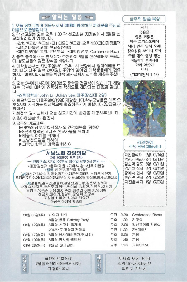 08/12/18 주일 교회 소식 페이지 정보 작성자 댓글 0건 조회 2,439회 작성일 18-08-11 12:01 목록 본문 이전글08/19/18 주일 교회 소식 18.08.18 다음글08/05/18 주일 교회 소식 18.08.04 댓글 0 댓글목록 등록된 댓글이 없습니다. 목록