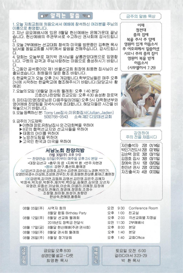 08/19/18 주일 교회 소식 페이지 정보 작성자 댓글 0건 조회 2,804회 작성일 18-08-18 10:22 목록 본문 이전글08/26/18 주일 교회 소식 18.08.25 다음글08/12/18 주일 교회 소식 18.08.11 댓글 0 댓글목록 등록된 댓글이 없습니다. 목록