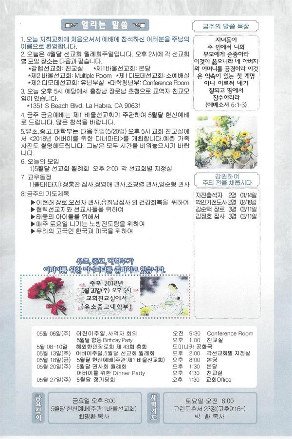 05/13/18 주일 교회 소식 페이지 정보 작성자 댓글 0건 조회 2,913회 작성일 18-05-12 09:23 목록 본문 이전글05/20/18 주일 교회 소식 18.05.19 다음글05/06/18 주일 교회 소식 18.05.05 댓글 0 댓글목록 등록된 댓글이 없습니다. 목록