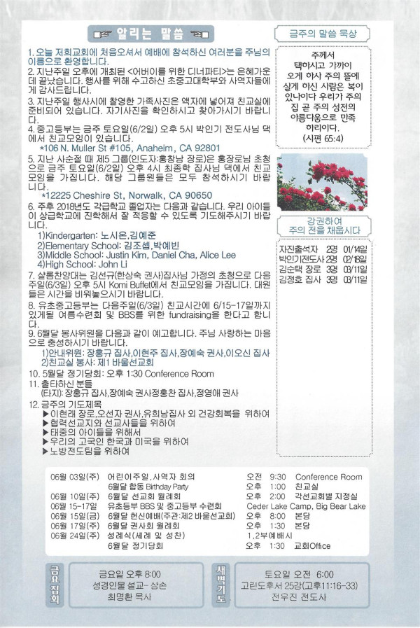 05/27/18 주일 교회 소식 페이지 정보 작성자 댓글 0건 조회 2,922회 작성일 18-05-26 12:40 목록 본문 이전글06/03/18 주일 교회 소식 18.06.02 다음글05/20/18 주일 교회 소식 18.05.19 댓글 0 댓글목록 등록된 댓글이 없습니다. 목록