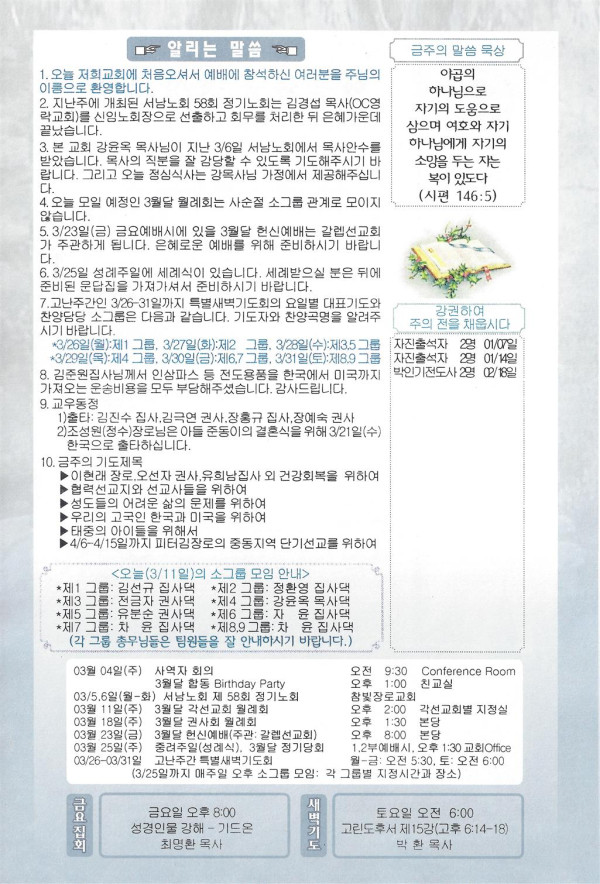 03/11/18 주일 교회 소식 페이지 정보 작성자 댓글 0건 조회 2,550회 작성일 18-03-10 09:26 목록 본문 이전글03/18/18 주일 교회 소식 18.03.17 다음글03/04/18 주일 교회 소식 18.03.03 댓글 0 댓글목록 등록된 댓글이 없습니다. 목록