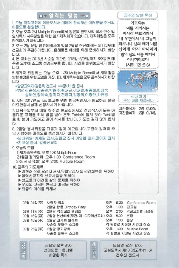 01/28/18 주일 교회 소식 페이지 정보 작성자 댓글 0건 조회 2,470회 작성일 18-01-27 09:28 목록 본문 이전글02/04/18 주일 교회 소식 18.02.03 다음글01/21/18 주일 교회 소식 18.01.20 댓글 0 댓글목록 등록된 댓글이 없습니다. 목록