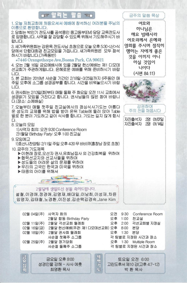 02/04/18 주일 교회 소식 페이지 정보 작성자 댓글 0건 조회 2,700회 작성일 18-02-03 15:25 목록 본문 이전글02/11/18 주일 교회 소식 18.02.10 다음글01/28/18 주일 교회 소식 18.01.27 댓글 0 댓글목록 등록된 댓글이 없습니다. 목록