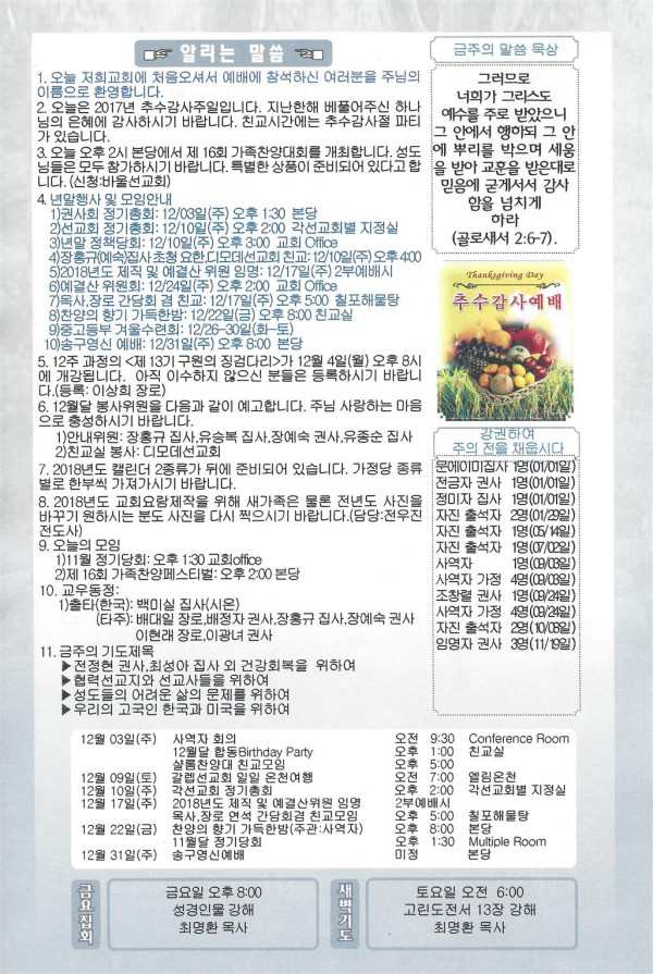 11/26/17 주일 교회 소식 페이지 정보 작성자 댓글 0건 조회 2,734회 작성일 17-11-25 11:42 목록 본문 이전글12/03/17 주일 교회 소식 17.12.02 다음글11/19/17 주일 교회 소식 17.11.18 댓글 0 댓글목록 등록된 댓글이 없습니다. 목록