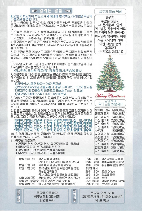 12/24/17 주일 교회 소식 페이지 정보 작성자 댓글 0건 조회 2,720회 작성일 17-12-23 10:06 목록 본문 이전글12/31/17 주일 교회 소식 17.12.30 다음글12/17/17 주일 교회 소식 17.12.16 댓글 0 댓글목록 등록된 댓글이 없습니다. 목록