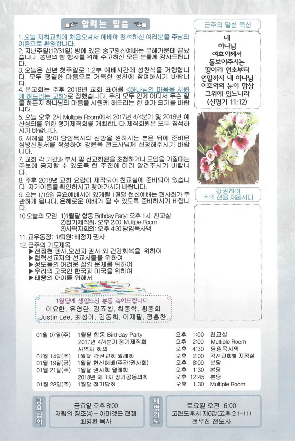 01/07/18 주일 교회 소식 페이지 정보 작성자 댓글 0건 조회 2,684회 작성일 18-01-06 00:00 목록 본문 이전글01/14/18 주일 교회 소식 18.01.13 다음글12/31/17 주일 교회 소식 17.12.30 댓글 0 댓글목록 등록된 댓글이 없습니다. 목록