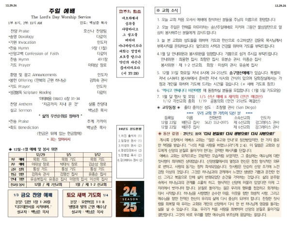 12/29/24 교회 주보 페이지 정보 작성자 아름다운동산교회 댓글 0건 조회 1,670회 작성일 24-12-28 07:47 목록 본문 12/29/24 이전글01/05/25 교회 주보 25.01.04 다음글12/22/24 교회 주보 24.12.21 댓글 0 댓글목록 등록된 댓글이 없습니다. 목록