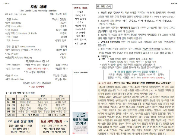 01/05/25 교회 주보 페이지 정보 작성자 아름다운동산교회 댓글 0건 조회 1,324회 작성일 25-01-04 07:56 목록 본문 01/05/24 이전글01/12/25 교회 주보 25.01.11 다음글12/29/24 교회 주보 24.12.28 댓글 0 댓글목록 등록된 댓글이 없습니다. 목록
