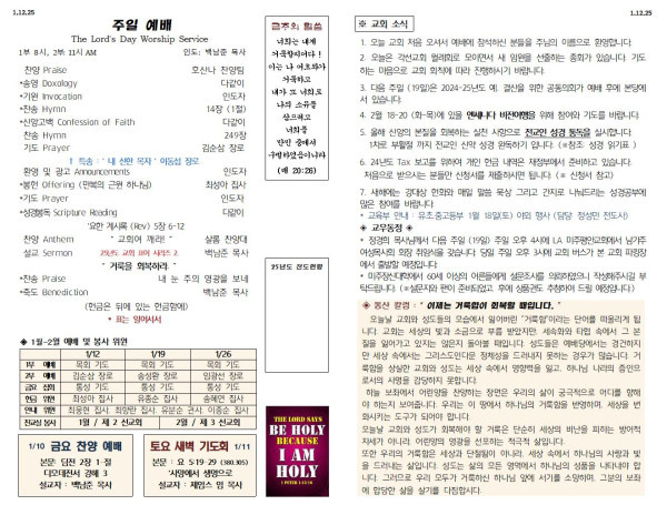 01/12/25 교회 주보 페이지 정보 작성자 아름다운동산교회 댓글 0건 조회 1,218회 작성일 25-01-11 08:12 목록 본문 01/12/25 이전글01/19/25 교회 주보 25.01.18 다음글01/05/25 교회 주보 25.01.04 댓글 0 댓글목록 등록된 댓글이 없습니다. 목록