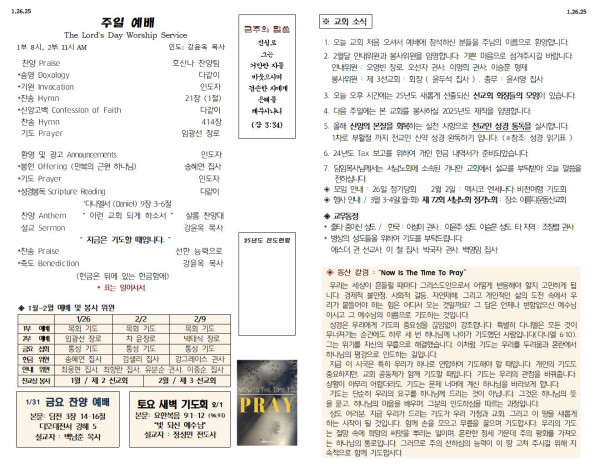01/26/25 교회 주보 페이지 정보 작성자 아름다운동산교회 댓글 0건 조회 1,437회 작성일 25-01-25 07:44 목록 본문 01/26/25 이전글02/02/25 교회 주보 25.02.01 다음글01/19/25 교회 주보 25.01.18 댓글 0 댓글목록 등록된 댓글이 없습니다. 목록