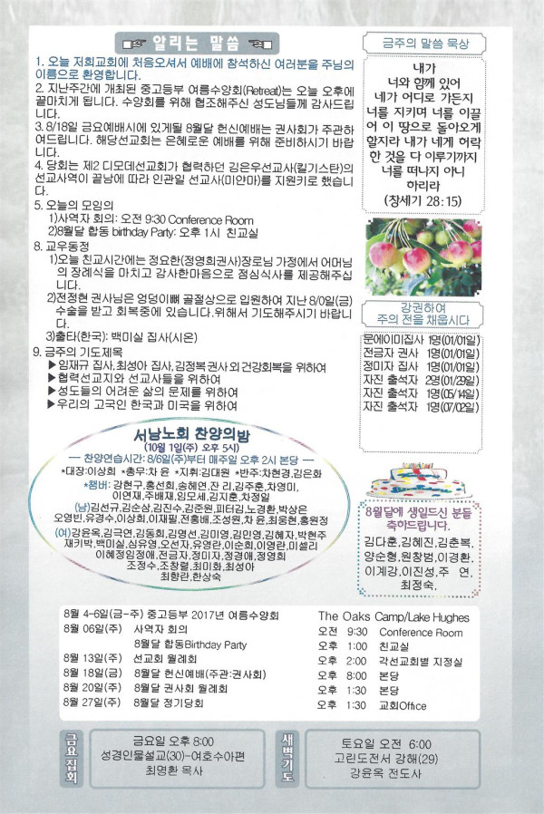 08/06/17 주일 교회소식 페이지 정보 작성자 댓글 0건 조회 2,833회 작성일 17-08-05 11:59 목록 본문 이전글08/13/17 주일 교회 소식 17.08.12 다음글07/30/17 주일 교회 소식 17.07.29 댓글 0 댓글목록 등록된 댓글이 없습니다. 목록