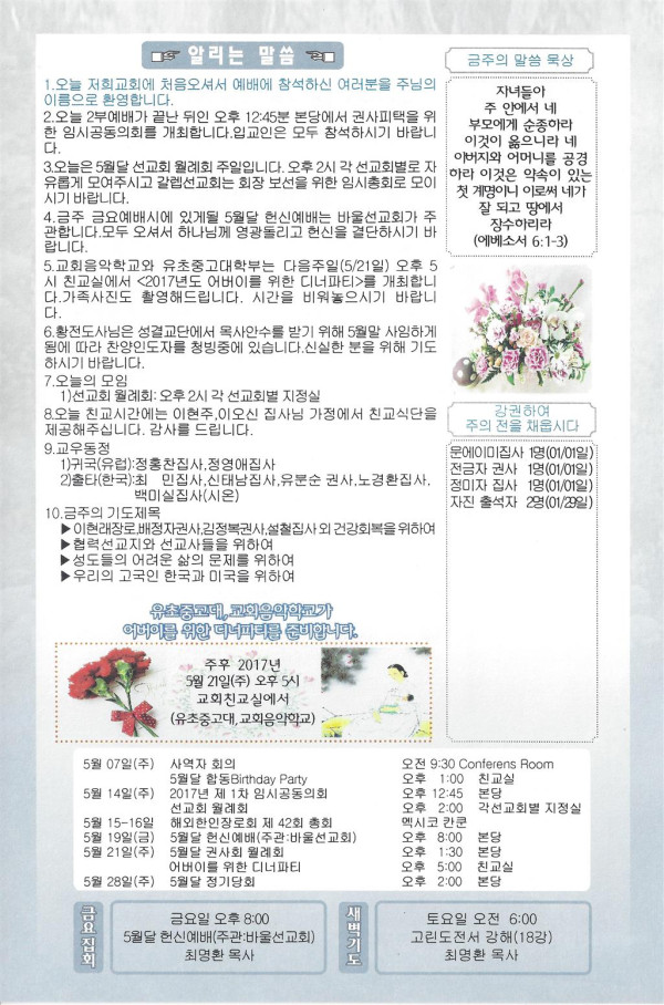 05/14/17 주일 교회 소식 페이지 정보 작성자 댓글 0건 조회 2,915회 작성일 17-05-13 11:46 목록 본문 이전글05/21/17 주일 교회 소식 17.05.20 다음글05/07/17 주일 교회 소식 17.05.06 댓글 0 댓글목록 등록된 댓글이 없습니다. 목록