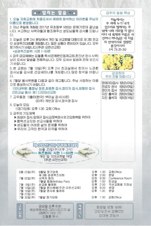 06/25/17 주일 교회 소식 페이지 정보 작성자 댓글 0건 조회 2,975회 작성일 17-06-24 15:47 목록 본문 이전글07/02/17 주일 교회 소식 17.07.01 다음글06/18/17 주일 교회 소식 17.06.17 댓글 0 댓글목록 등록된 댓글이 없습니다. 목록