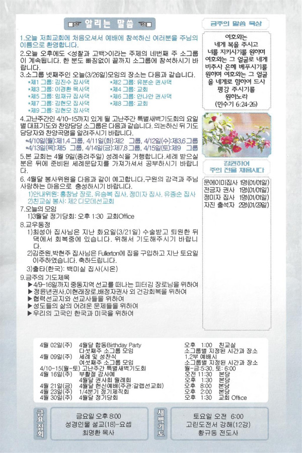03/26/17 주일 교회 소식 페이지 정보 작성자 댓글 0건 조회 2,703회 작성일 17-03-25 00:00 목록 본문 이전글04/02/17 주일 교회 소식 17.04.01 다음글03-19-17 주일 교회 소식 17.03.18 댓글 0 댓글목록 등록된 댓글이 없습니다. 목록