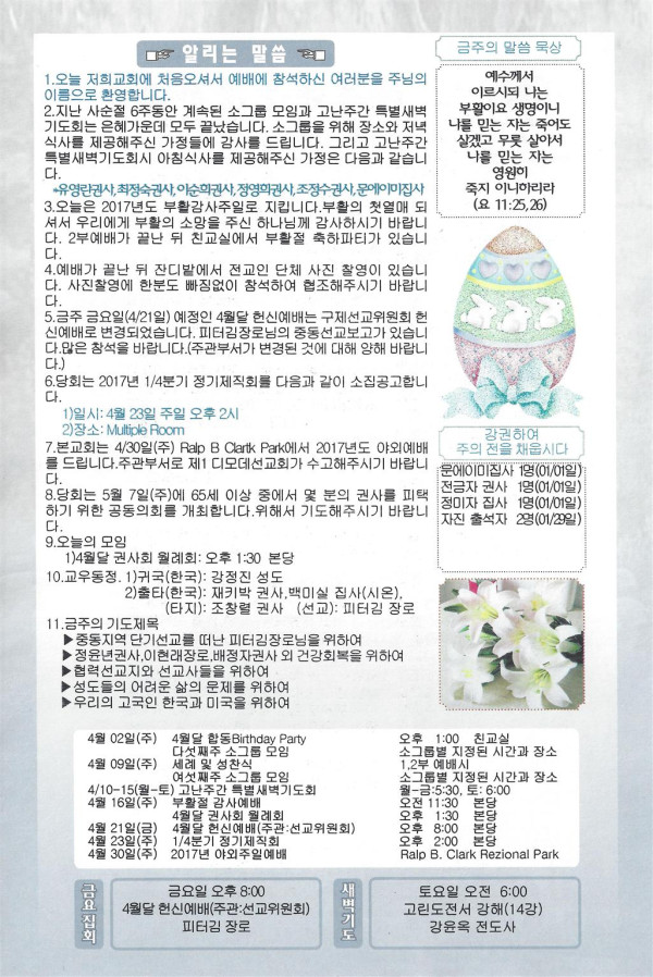 04/16/17 부활감사주일 교회 소식 페이지 정보 작성자 댓글 0건 조회 2,840회 작성일 17-04-15 11:14 목록 본문 이전글04/23/17 주일 교회 소식 17.04.22 다음글04/09/17 주일 교회 소식 17.04.08 댓글 0 댓글목록 등록된 댓글이 없습니다. 목록