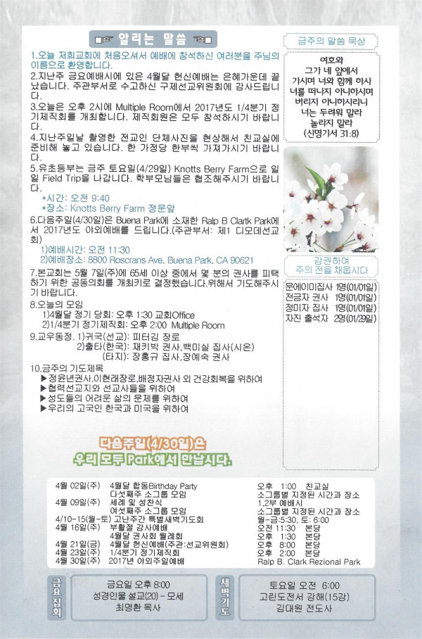 04/23/17 주일 교회 소식 페이지 정보 작성자 댓글 0건 조회 2,802회 작성일 17-04-22 00:00 목록 본문 이전글04/30/17 주일 교회 소식 17.04.29 다음글04/16/17 부활감사주일 교회 소식 17.04.15 댓글 0 댓글목록 등록된 댓글이 없습니다. 목록